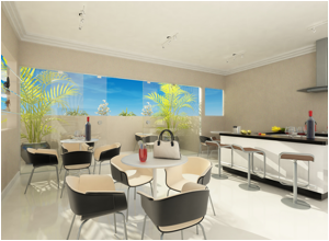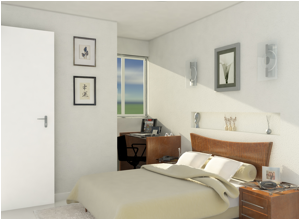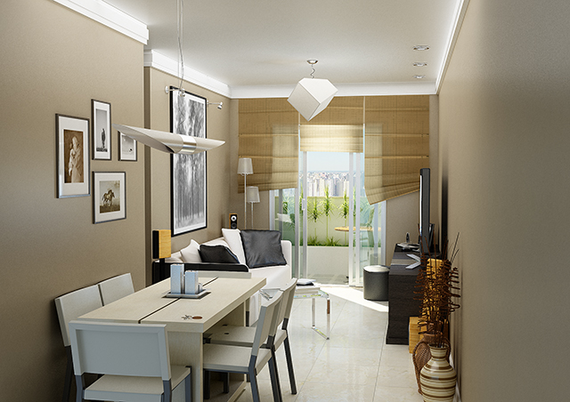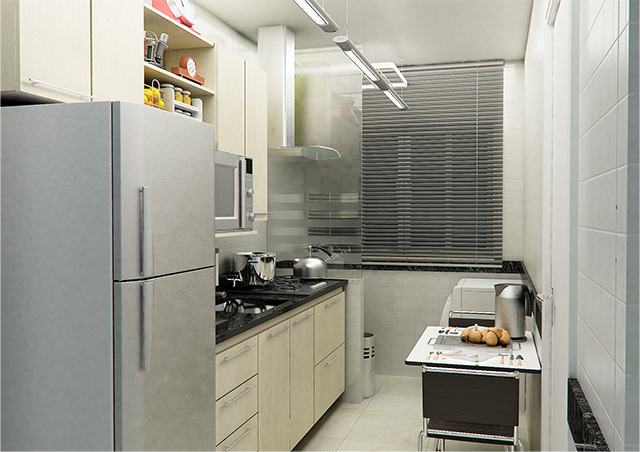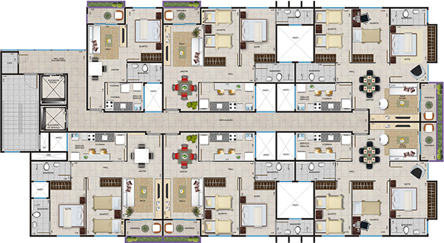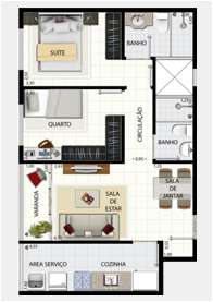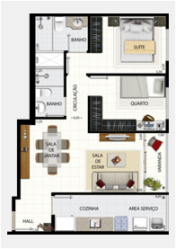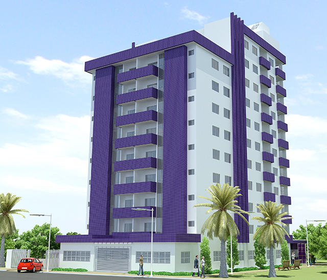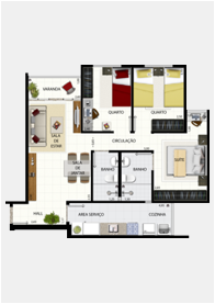 Os apartamentos de 3 quartos são constituídos de sala de estar e jantar com varanda, 1 suite, 2 quartos, banheiro social, cozinha, área de serviço, banheiro de serviço e 1 vaga de garagem.